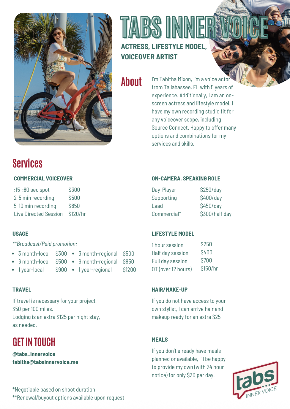 That’s why I’m sharing my Rate Card, with sample pricing for both voiceover and on-screen gigs. You’ll find breakdowns by usage type, session length, and add-ons, so you can budget with clarity and confidence.